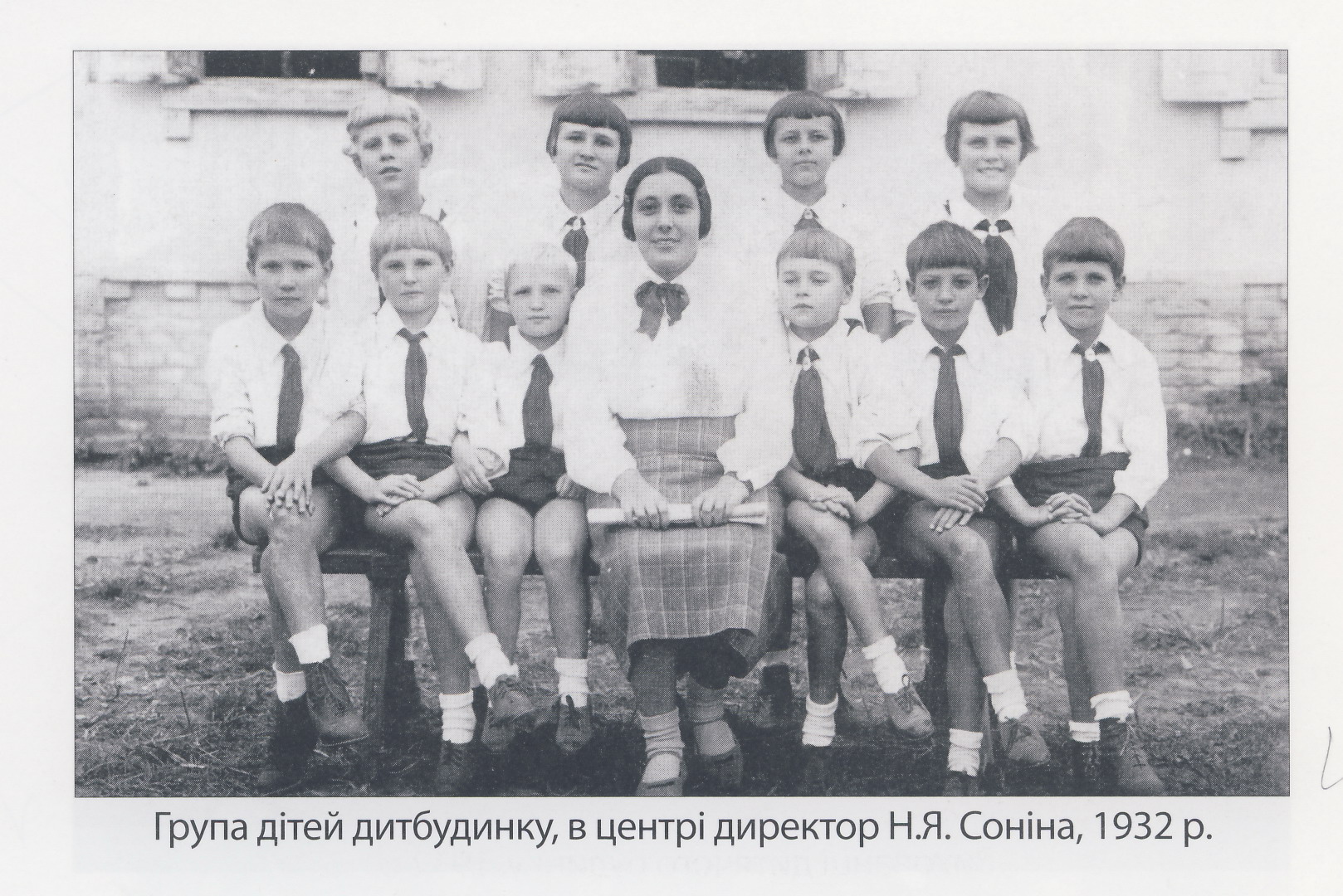 Верхнє: Вихованці дитячого будинку. У центрі – директорка дитбудинку Н. Я. Соніна., 1932 р.
