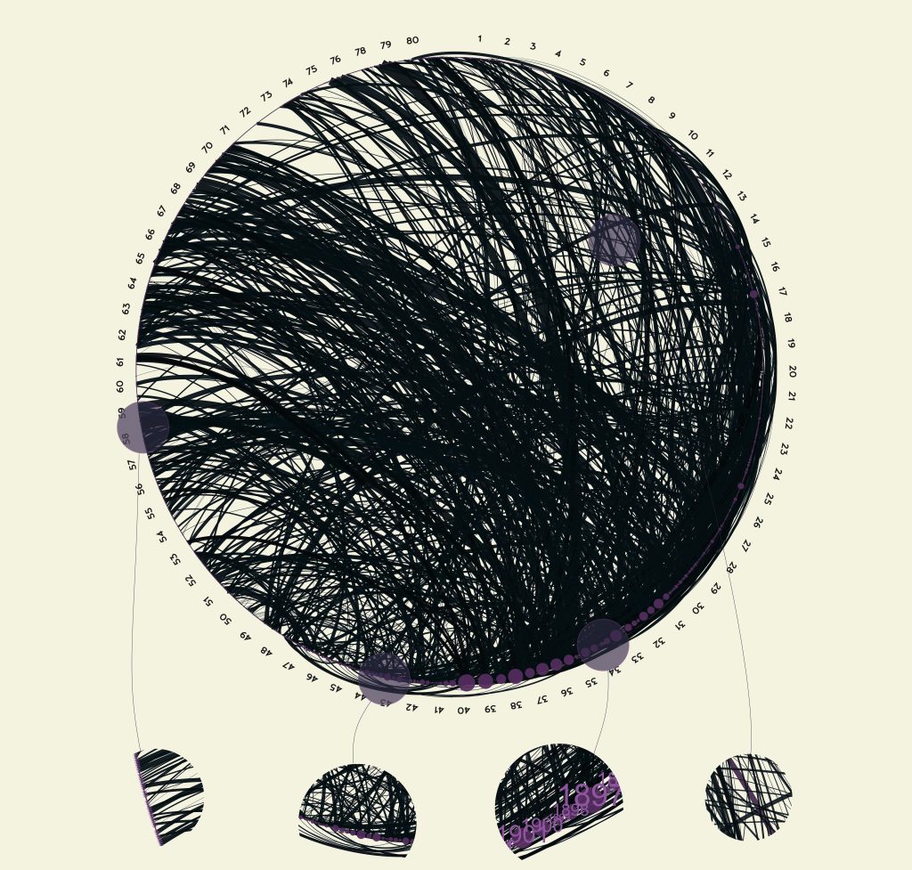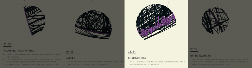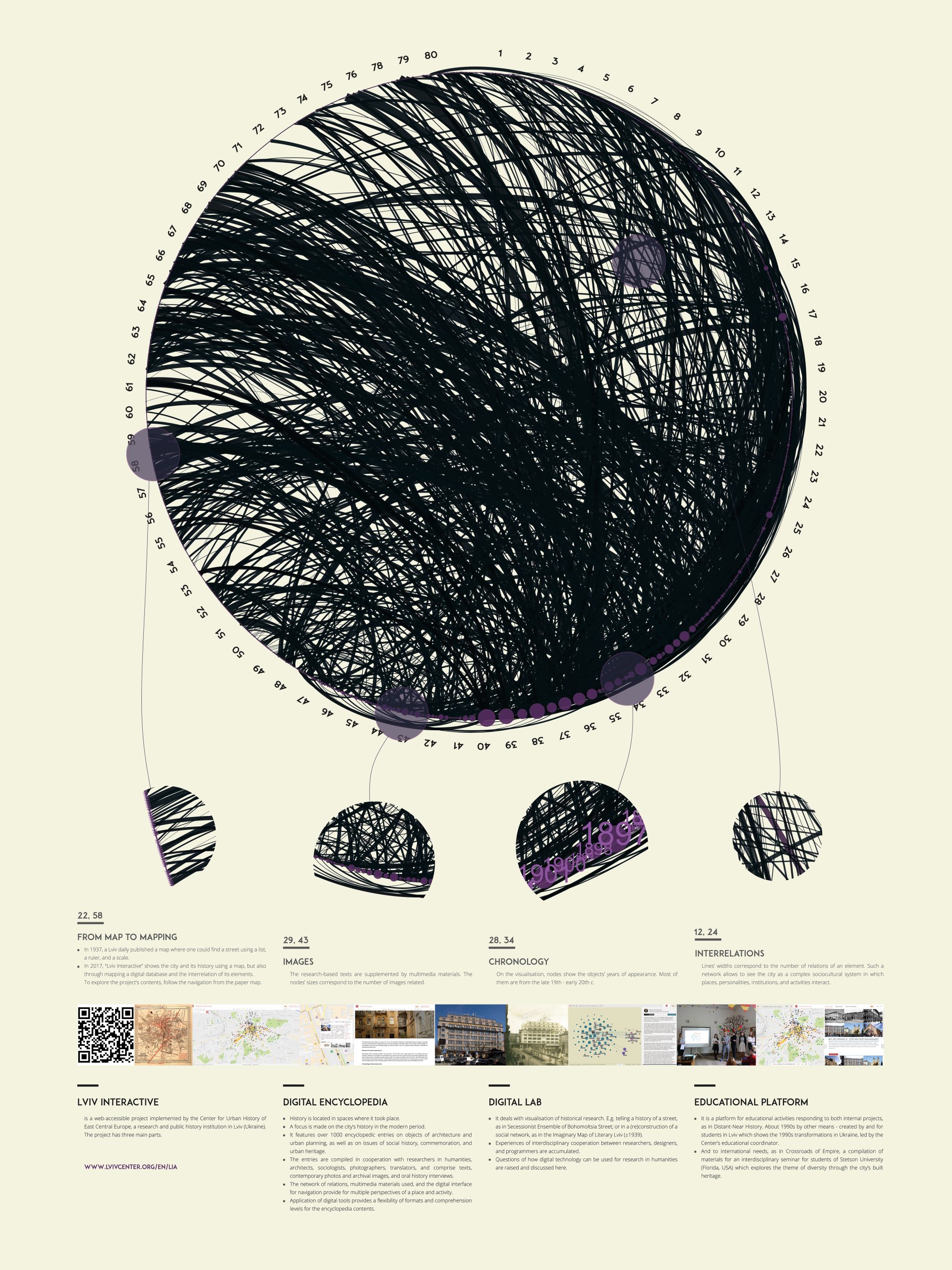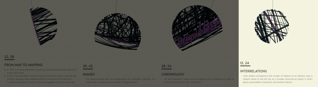 Фрагмент Interrelations показує нам ще одну важливу складову цифрових проектів. Товщина кожної з ліній пояснює кількість зв'язків одного об'єкта з іншими. База даних "Інтерактивного Львова" передбачає не лише існування набору об’єктів, упорядкованого за певними категоріями (хронологією, типом будівлі, розташуванням тощо), а й побудовою пов’язань цього об’єкту з іншими у місті. Таким чином, погляд на окрему будівлю може бути поглядом на частину ширшої мережі пов’язань з іншими місцями, інституціями, персоналіями, а отже частину більш складної соціокультурної системи, якою є місто.