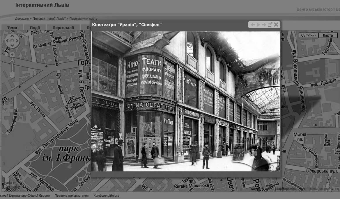 Проект "Кінотеатри Львова" ставить за мету відобразити на інтерактивній мапі Львова ("Інтерактивний Львів") історію зародження та подальшого розвитку львівського "кіноландшафту". Першим завданням тому є збір та показ інформації про місця розташування кінотеатрів, архітектуру будівель, у яких вони містилися, та їх подальших адаптацій; про зміни назв кінотеатрів, власників, репертуар. Хронологія проекту починається від часу першого кінопоказу в Львові 1896 р. і веде аж до сьогодні.