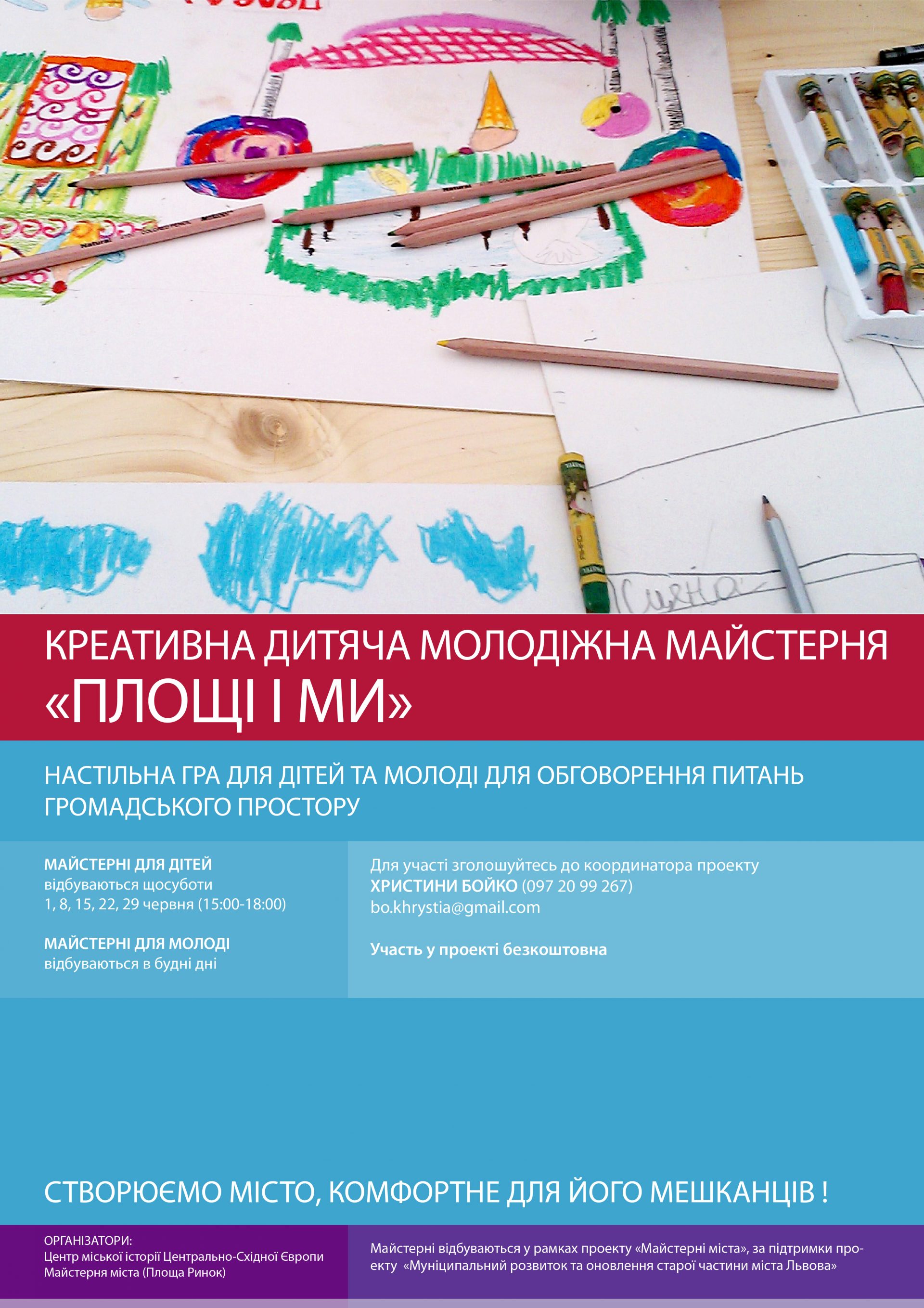 Майстерні - це серія зустрічей, де в грі та творчості діти та молодь розглядали поняття громадського простору. За основу гри взято класичну "Монополію". Ігровий процес, за допомогою чіткої простої моделі, описував основні етапи та засоби формування громадського простору.
