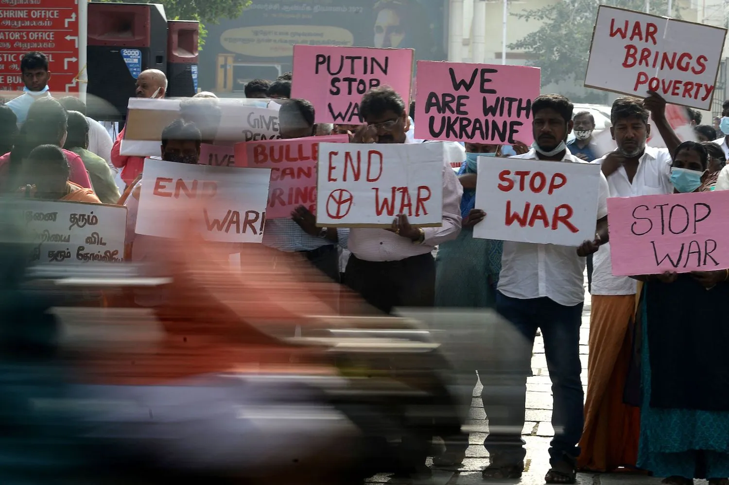 Cover Image: People hold placards protesting Russia's invasion of Ukraine outside the São Tomé Cathedral in Chennai, India, March 2, 2022. ARUN SANKAR/AFP VIA GETTY IMAGES