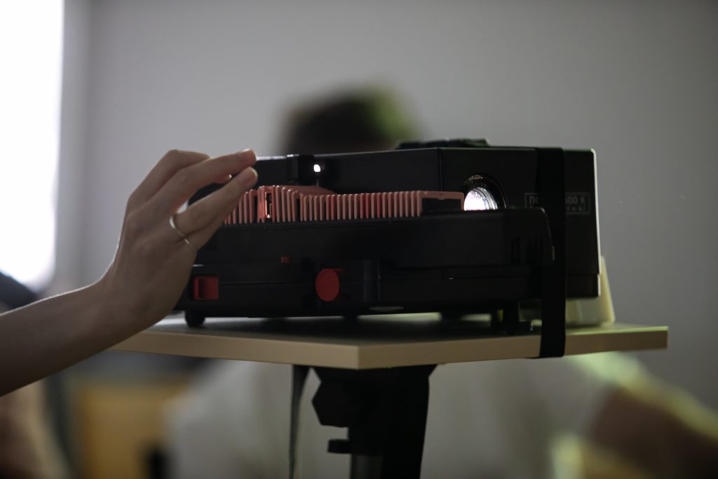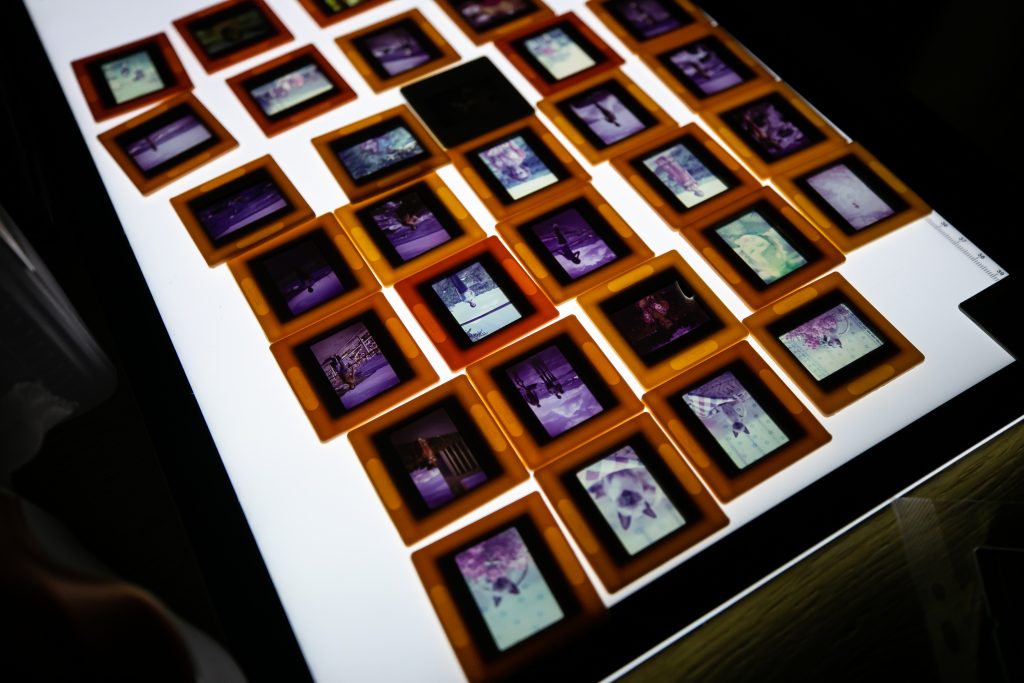 The practices of viewing printed photographs and slides also differed. While viewing photographs did not require any additional devices, slide film was viewed with diascopes or diaprojectors that scaled the image and enhanced the brightness of colors. This technology was also interesting for artists, who experimented with collages and film overlays. In addition to its visual appeal, this viewing technology had another advantage: it enabled a wider audience. Thus, slides were viewed not only in the family circle, but also in classrooms. Nowadays, digital images, liquid crystal screens, and video projectors have replaced the previous technologies, and bright backlit images are not uncommon.