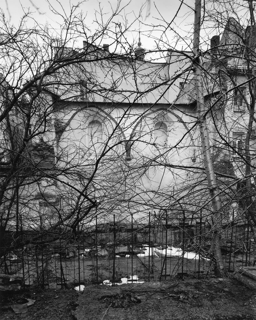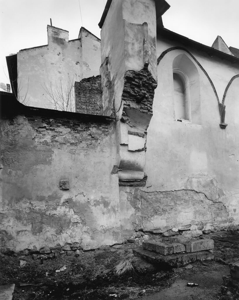 In his project implemented in 2014, the photographer combines large-format photography, drawing, and writing. The black and white photographs show the building's present, while the chalk drawings depict imagined vision of the synagogue before the war. The project holds a contradiction between the perceived and real Golden Rose. The Mourner, a character that appears in the essay, speaks the voice of the author as well as of the destroyed community that used to live here.