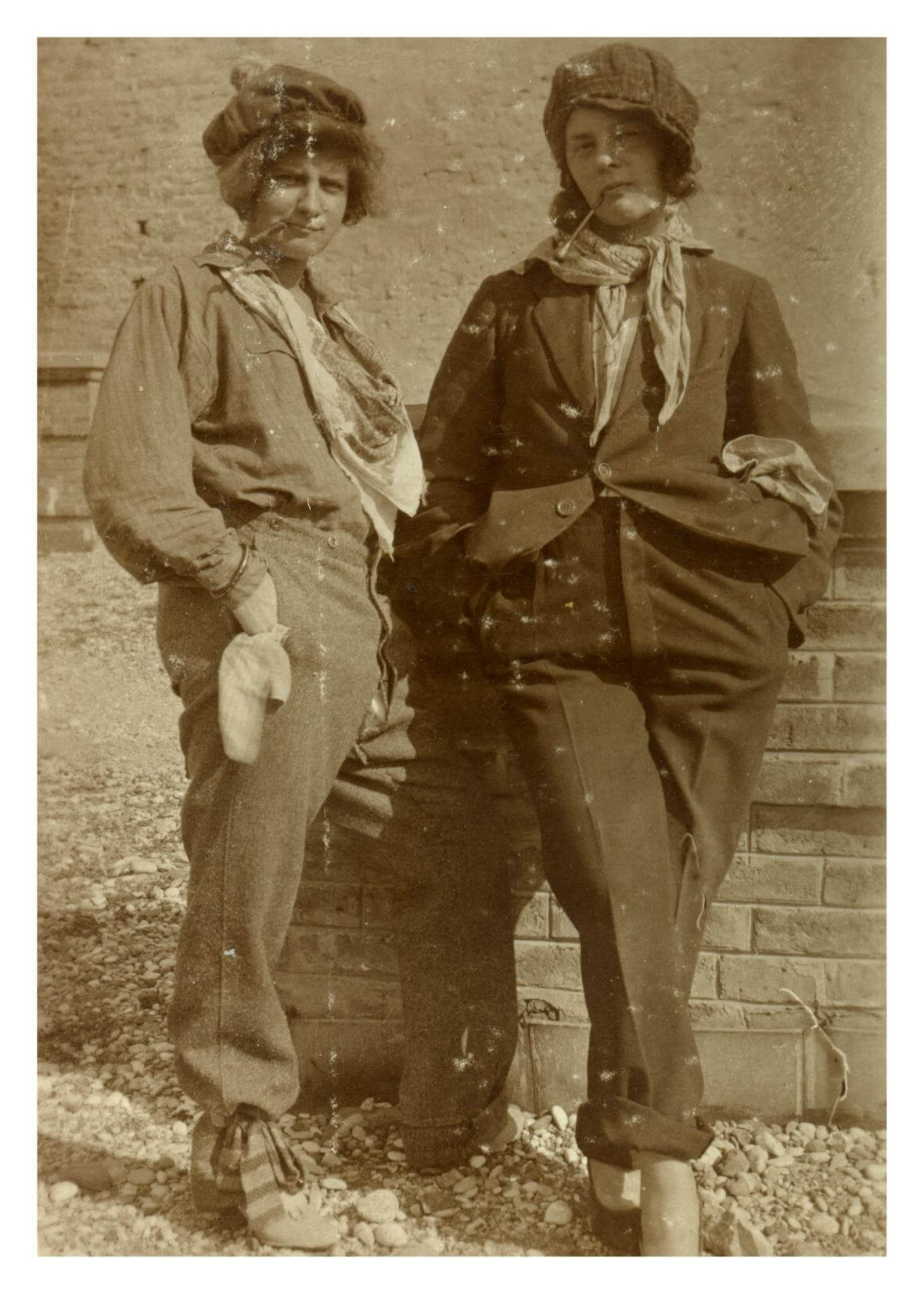 Two young ladies with cigarettes wearing slightly rolled over men’s pants are posing for a photo against a wall, with their hands in pockets. They flirt with the image that might be either their own, or the one near to them, or may be even odd. You can’t tell whether it’s serious or in jest.