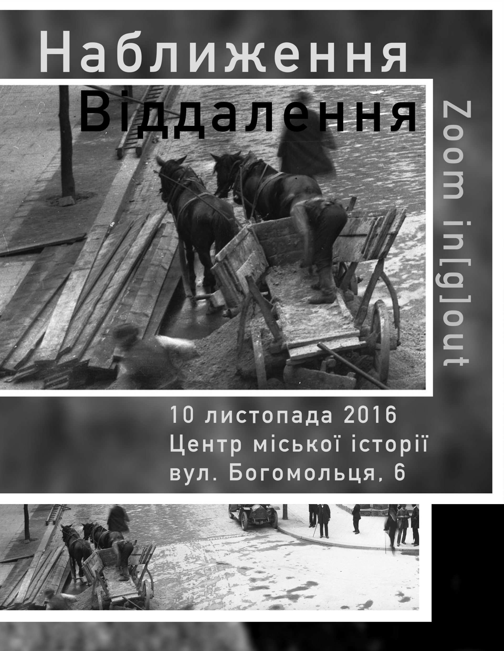 The exhibition of one picture from the second decade of the 20th century from the private collection of Alexander Korobov, which depicts daily life at the crossroads of current Hnatyuka and Sichovykh Striltsiv Streets in Lviv. The glass print was scanned at high resolution and printed as separate images at various magnifications. When looking at a single photograph up close, we are able to look at the most miniscule details, and in the process, lose the general context of the picture. By framing the images in such a way we create a new, completely independent image of a separate subject. Conversely, by zooming out, and considering the details or even abstract images, we can look for something larger and more general. How to find the best distance from which to view the complete picture and not lose detail?