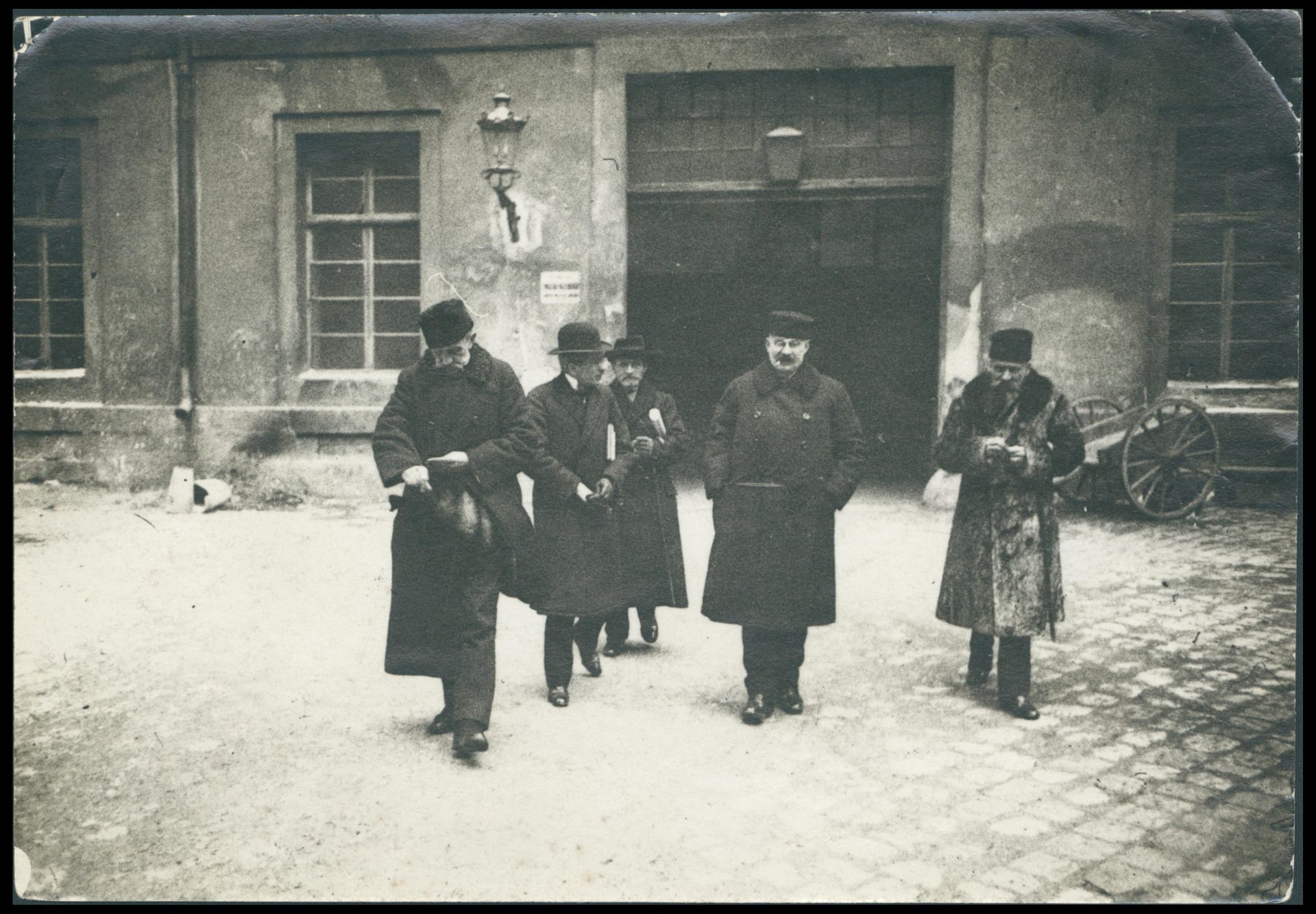 Cover Image: In the courtyard of the Town Hall in Russian-occupied Lviv. Aleksander Czołowski (center), Bohdan Janusz (second from left), and others are leaving the City Archives / January 1915 / Polona.pl