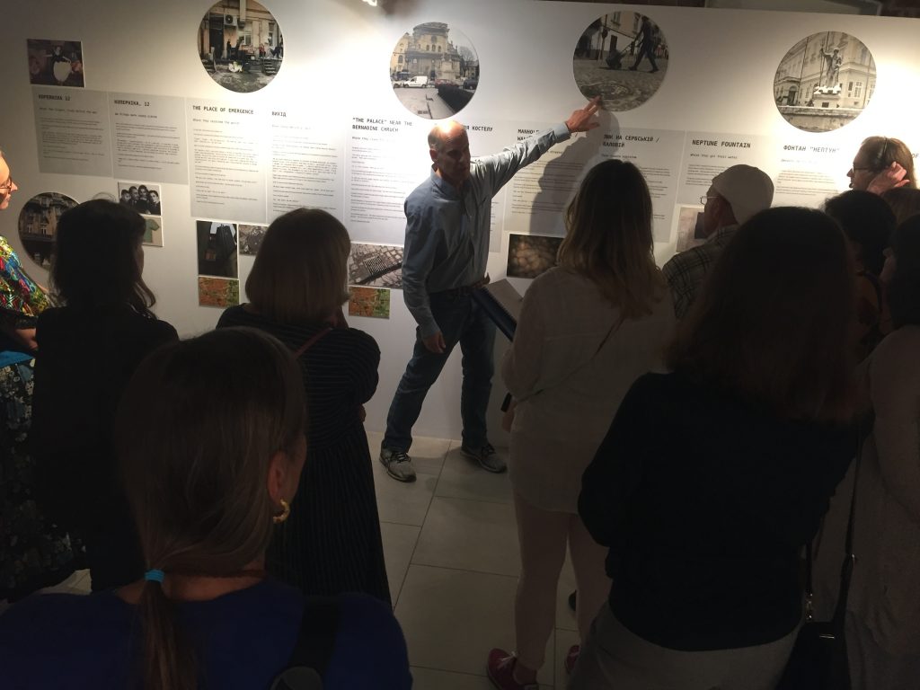 На авторській екскурсії ви дізнаєтеся більше, чому Рейчел Стівенс обрала цю тему і чому вона важлива для сучасного Львова. Що означає цифра 75 в її мистецькій інсталяції і який символічний зміст мисткиня вкладає у вираз “Ключ до міста”. Джек Райт розповість історію сім’ї Хіґер та інших євреїв, які вижили в час Голокосту у Львові, ховаючись 14 місяців у міських каналізаціях. Маркування та візуалізація на виставці 8-ми місць, де переховувалися євреї, пов’язання цих місць з сучасними просторами міста стане можливістю поговорити про складну історію Львова і про пам’ять про винищену спільноту міста. Тарас Назарук представить інтерактивну карту “100 адрес Львова” як спосіб оприсутнення єврейської спадщини через досвід творця карти – Бориса Орача. Ця карта унаочнює не лише місця, пов’язані з єврейською історією Львова, а й те як, в який спосіб і через які джерела львівська громада 1990-х відкривала для себе єврейський Львів.