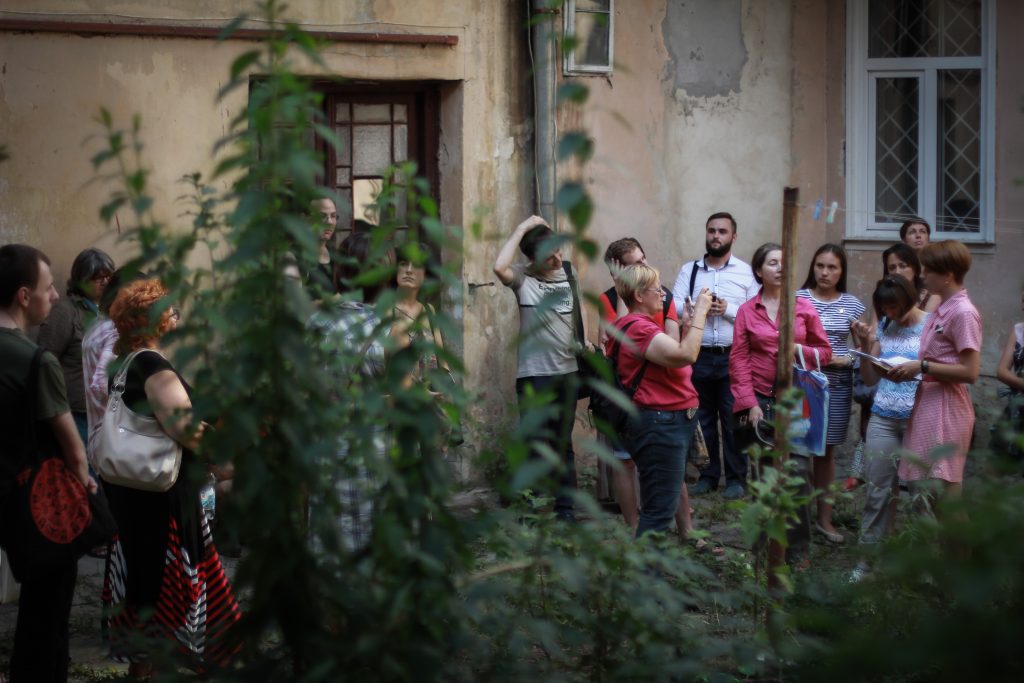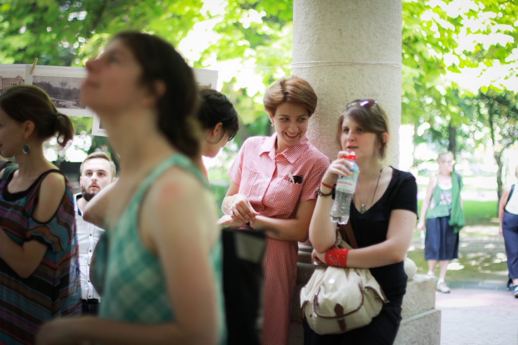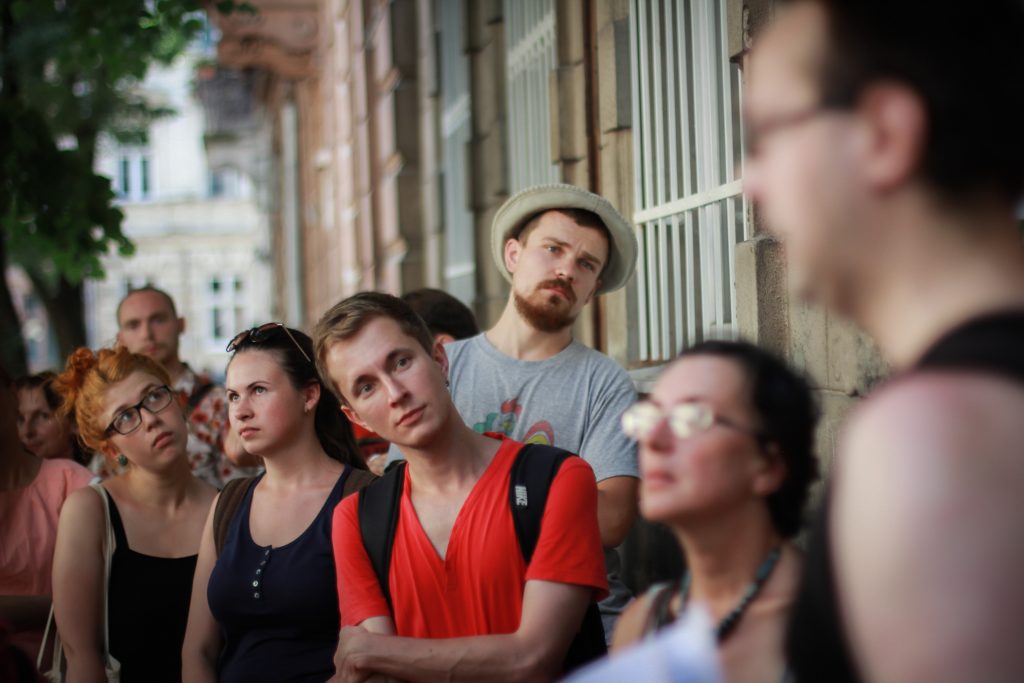 Міську прогулянку проводили учасники літної школи "Єврейська історія, спільне минуле і спадщина: культура, міста, середовища": Бартосєвіч Ольга (Польща), Маєвська Йоанна (Польща), Романов Борис (Росія), Рутар Христина (Україна), Вітринська Олена (Україна).