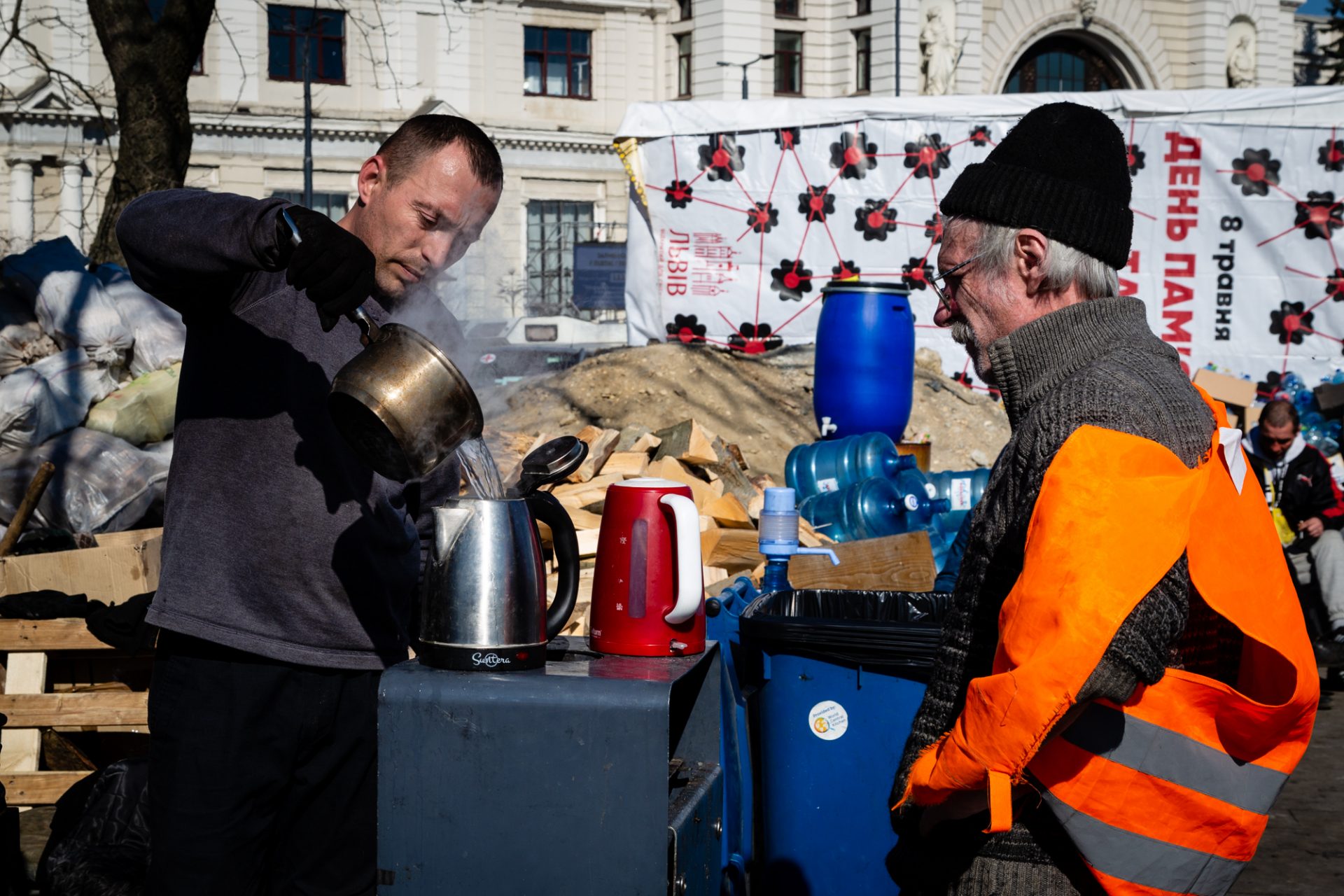 Верхнє: Волонтери готують їжу біля залізничного вокзалу у Львові / Катя Москалюк