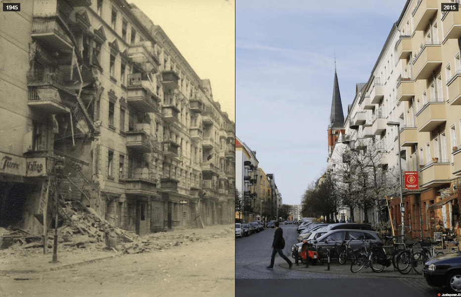 Верхнє: Незабаром після війни Берлін опинився в руїнах. Зображення радянського кореспондента Георгія Самсонова показують масштаби знищення. Через 70 років берлінський фотограф Фабріціо Бенш знову відвідує місця / interaktiv.morgenpost.de