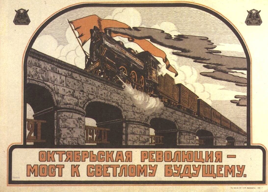Верхнє: Радянський агітаційній плакат "Жовтнева революція - міст до світлого майбутнього", 1929.